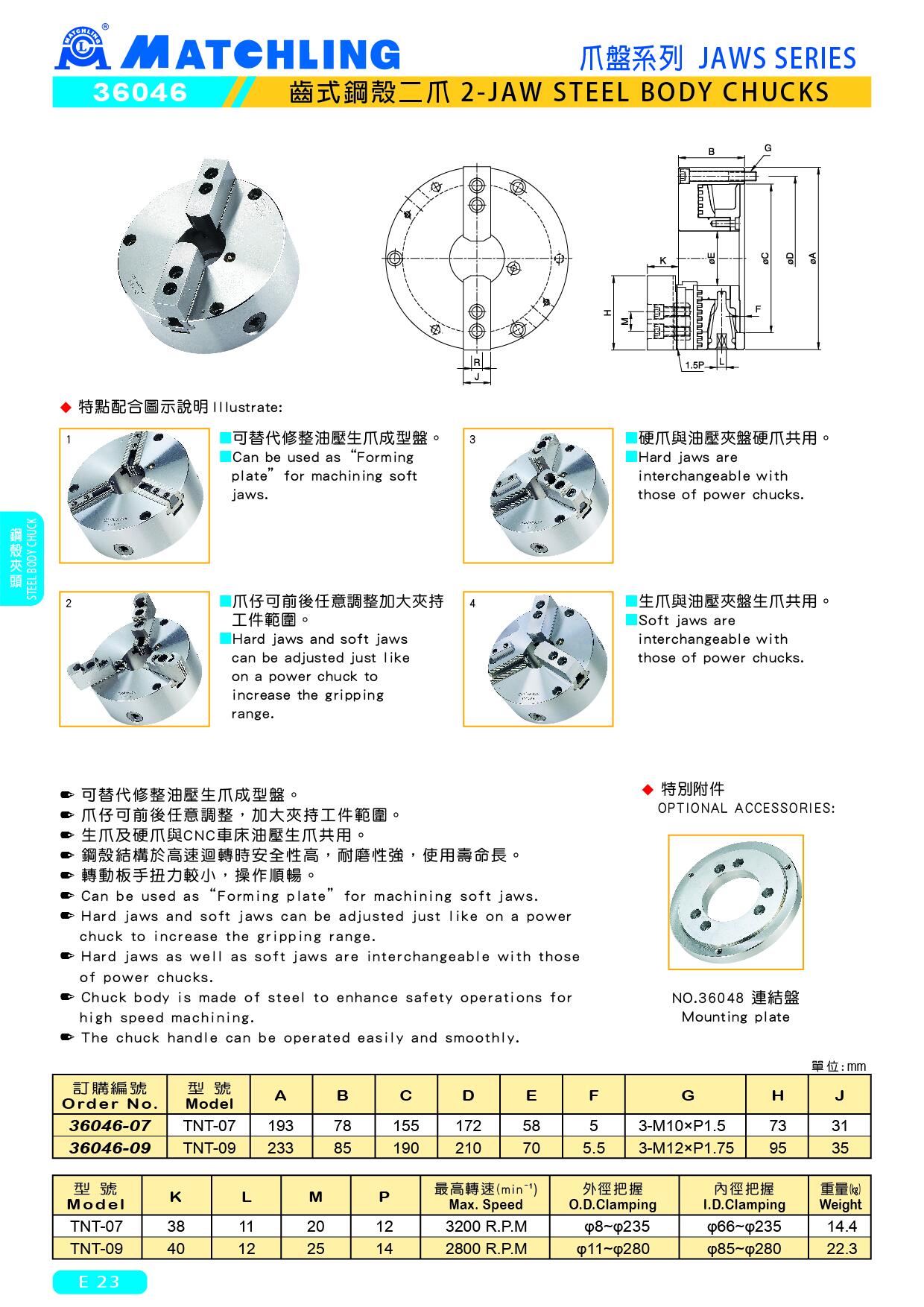 ● Hard jaws as well as soft jaws are interchangeable with those of power chucks.