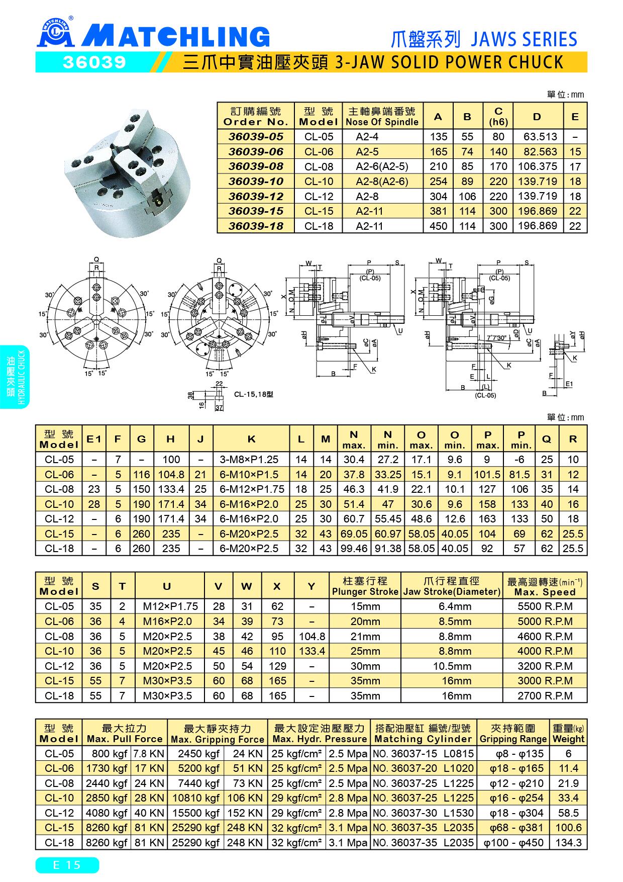 | CL-06 | 1730 kgf | 5200 kgf | 25 kgf/cm² | 2.5 Mpa | NO. 36037-20 L1020 | φ18 - φ165 | 11.4 |