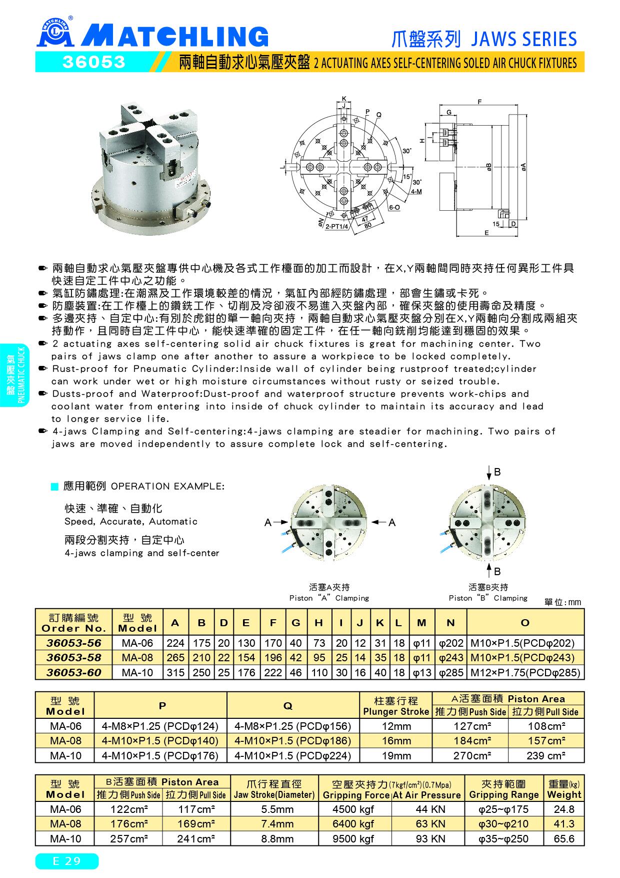 ● 2 actuating axes self-centering solid air chuck fixtures is great for machining center. Two pairs of jaws clamp one after another to assure a workpiece to be locked completely.