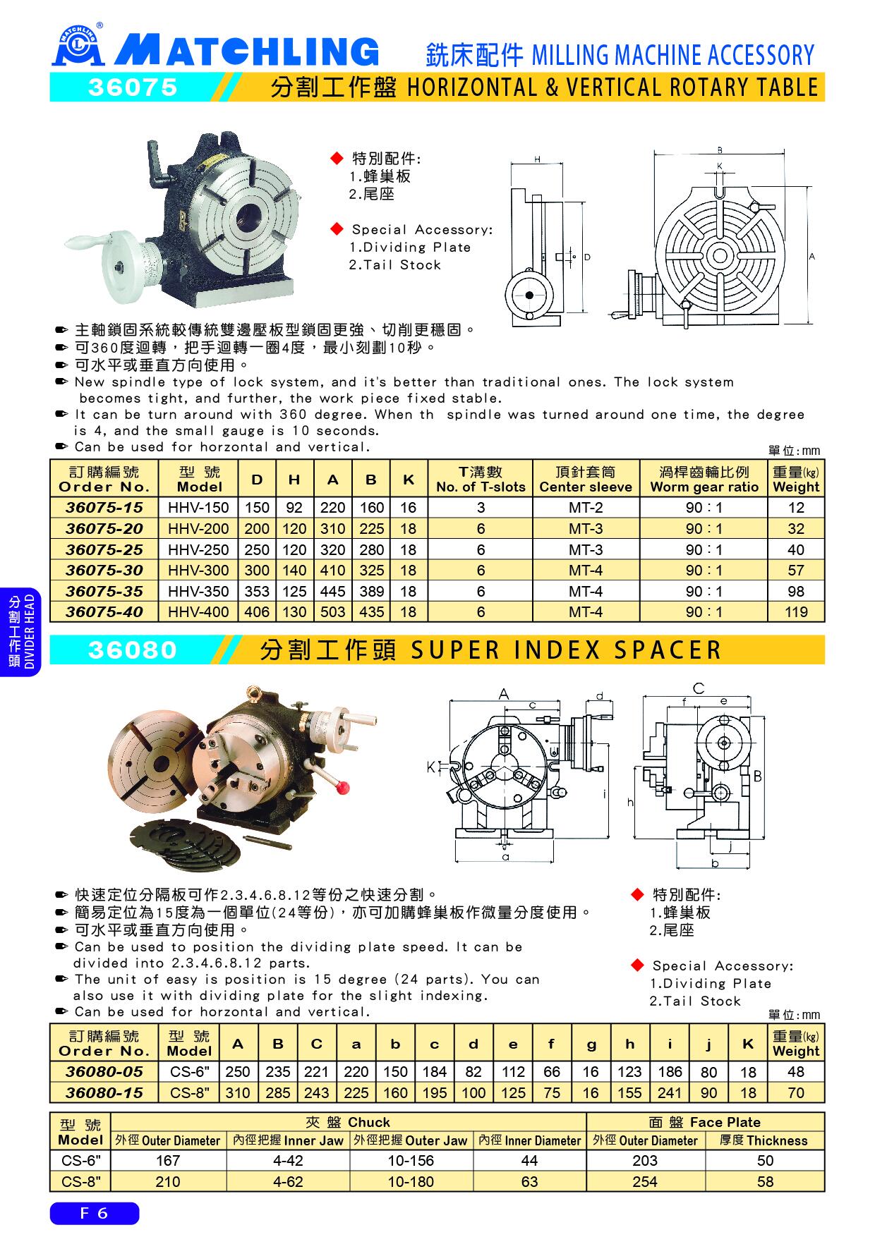 | Order No. | Model | D | H | A | B | K | No. of T-slots | Center sleeve | Worm gear ratio | Weight (kg) |