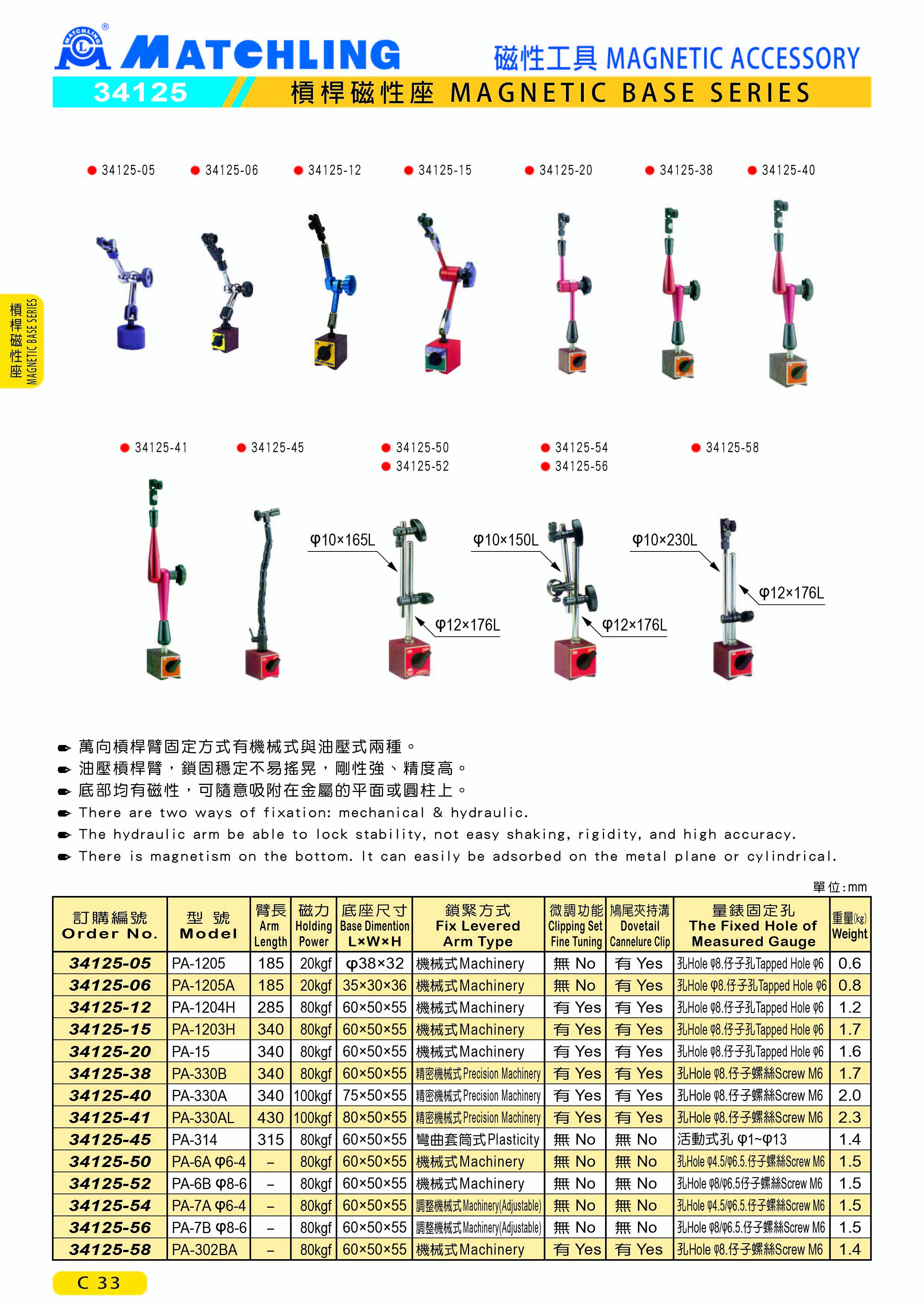 | Order No. | Model | Arm Length | Holding Power | Base Dimention LxWxH | Fix Levered Arm Type | Clipping Set Fine Tuning | Dovetail Cannelure Clip | The Fixed Hole of Measured Gauge | Weight (kg) |