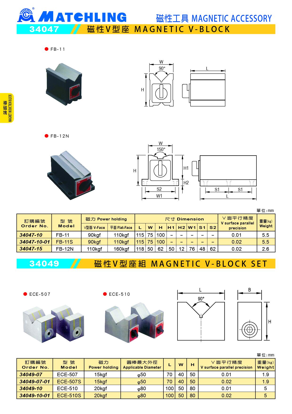 | Order No. | Model | Power Holding | Applicable Diameter | L | W | H | V - Suface Parallel Precision | Weight (kg) |