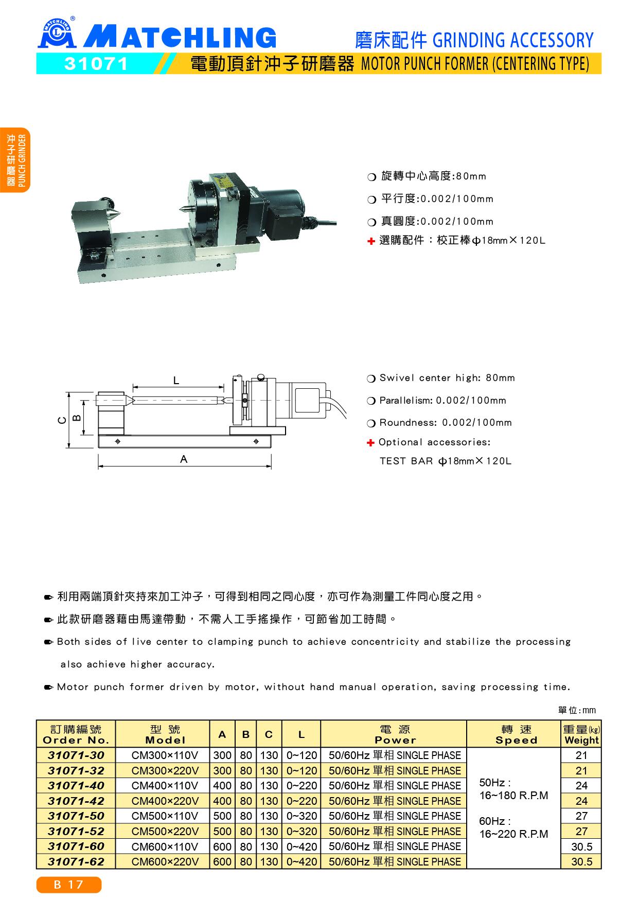 | 31071-60 | CM600×110V | 600 | 80 | 130 | 0 ~ 420 | 30.5 | ||