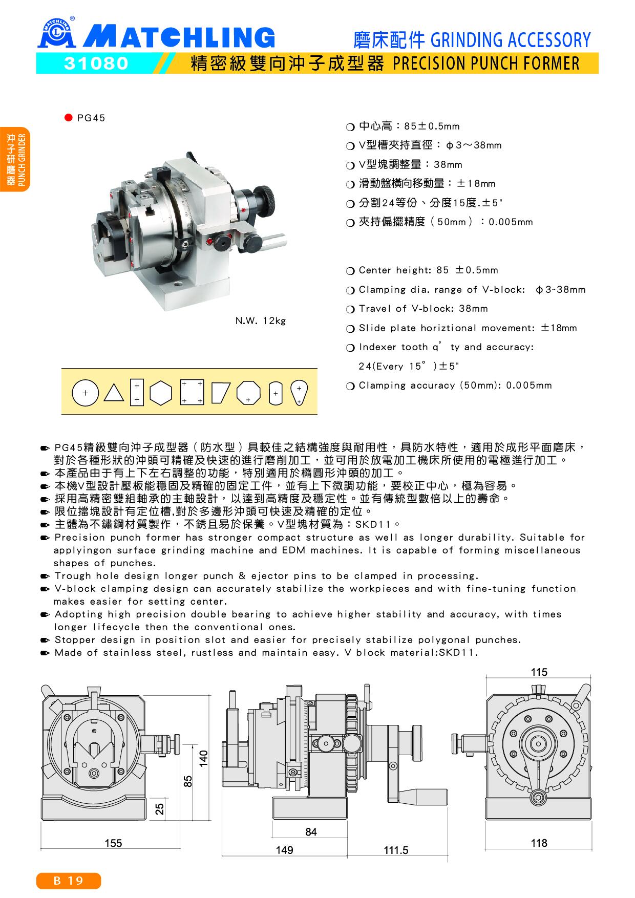 ● Precision punch former has stronger compact structure as well as longer durability. Suitable for applying on surface grinding machine and EDM machines. It is capable of forming miscellaneous shapes of punches.