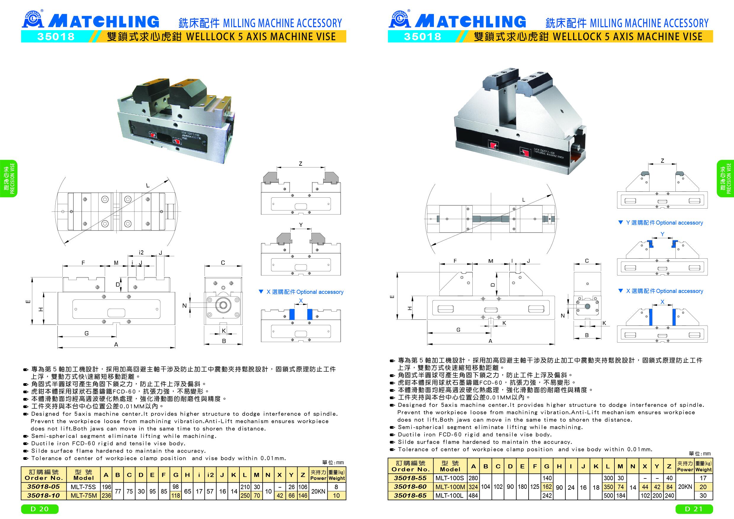 ● Designed for 5axis machine center.It provides higher structure to dodge interference of spindle. Prevent the workpiece loose from machining vibration. Anti-Lift mechanism ensures workpiece does not lift. Both jaws can move in the same time to shoren the distance.